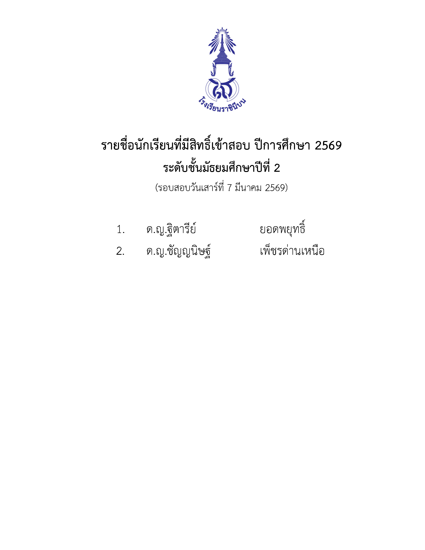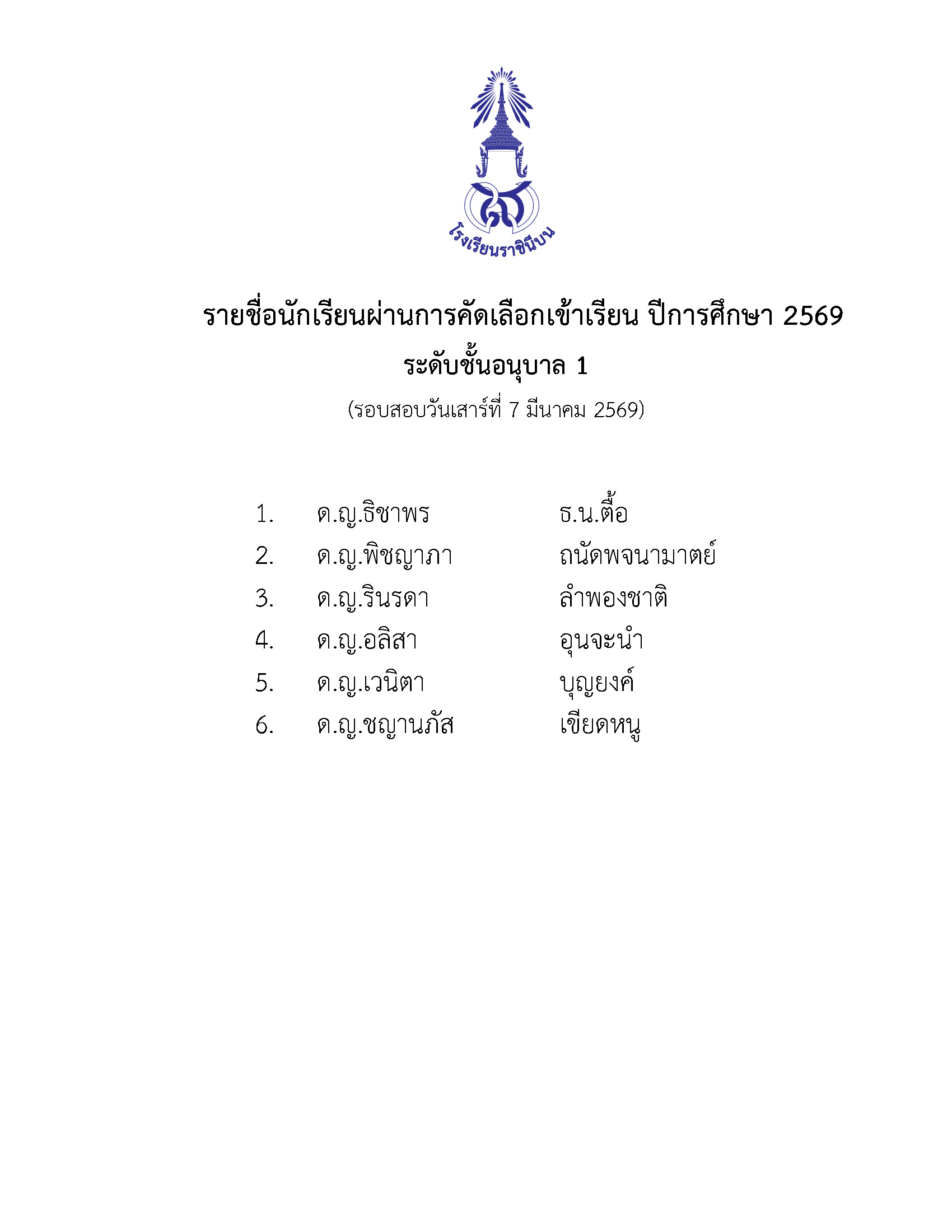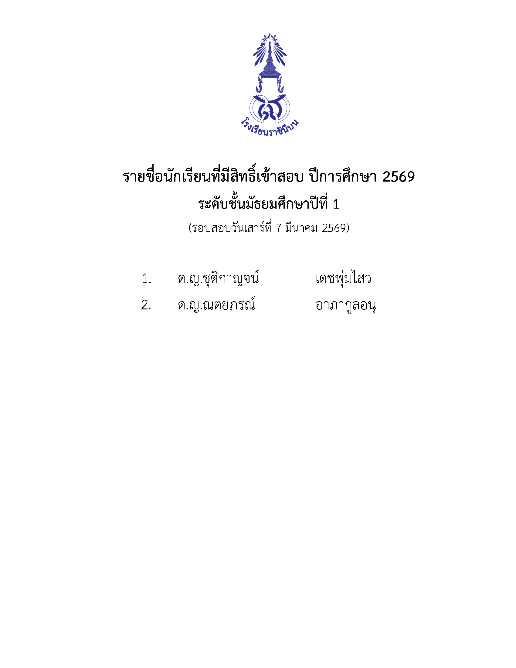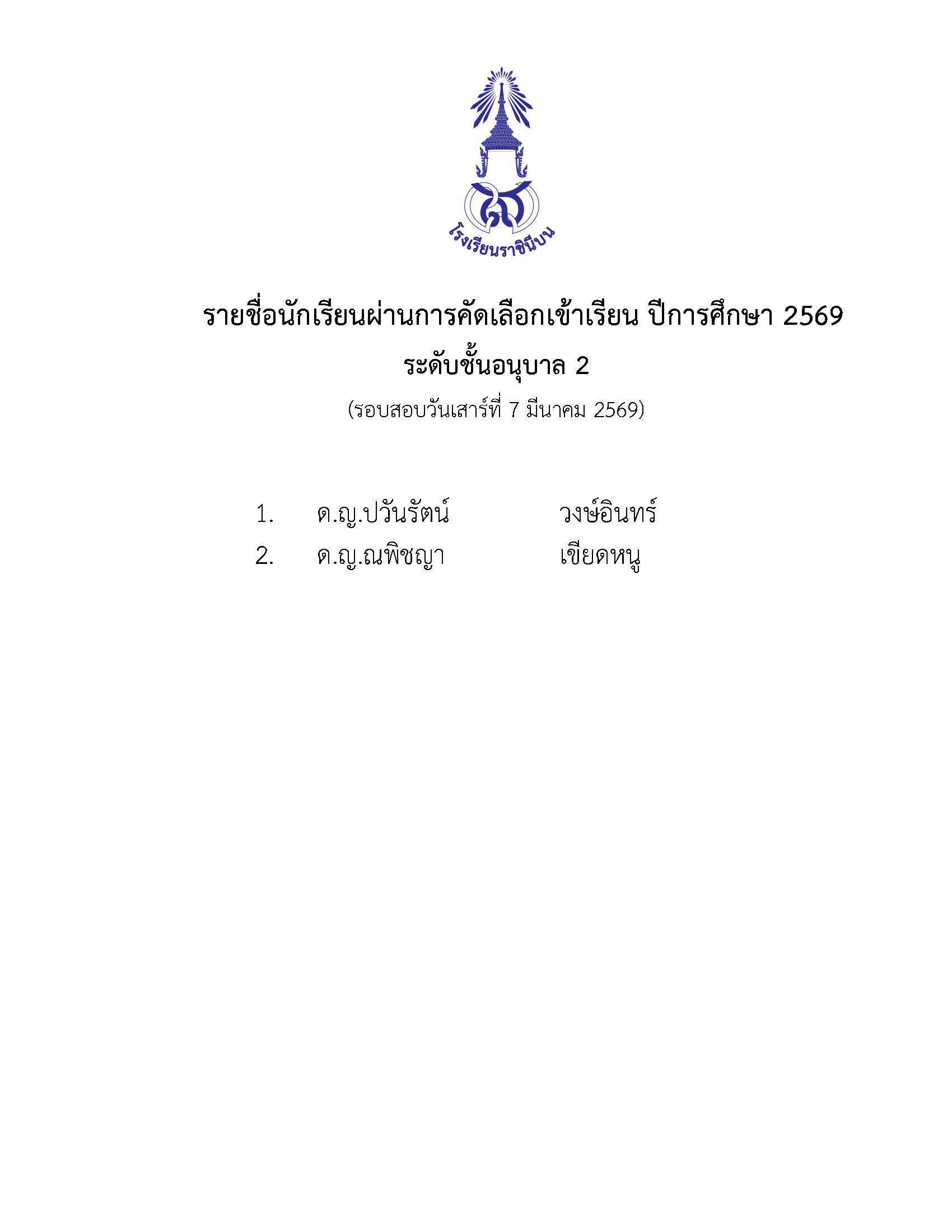 รายชื่อนักเรียนผ่านการคัดเลือกเข้าเรียน ปีการศึกษา 2569