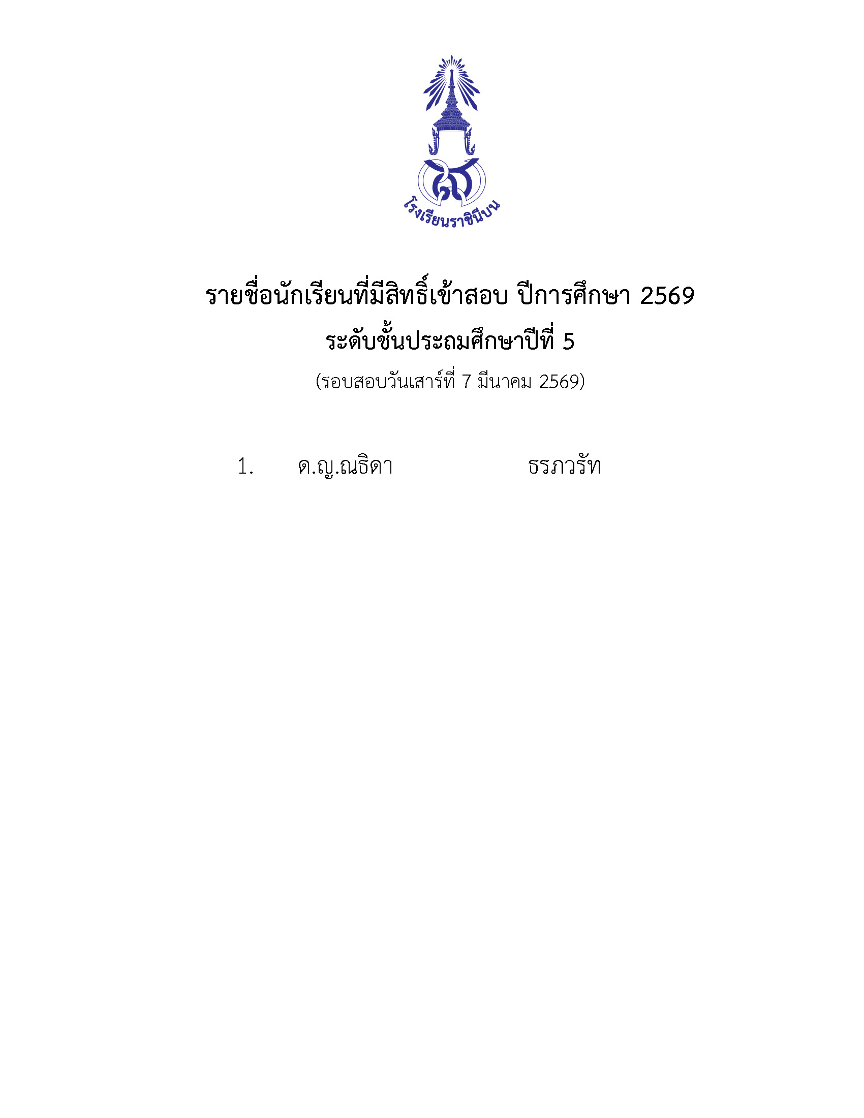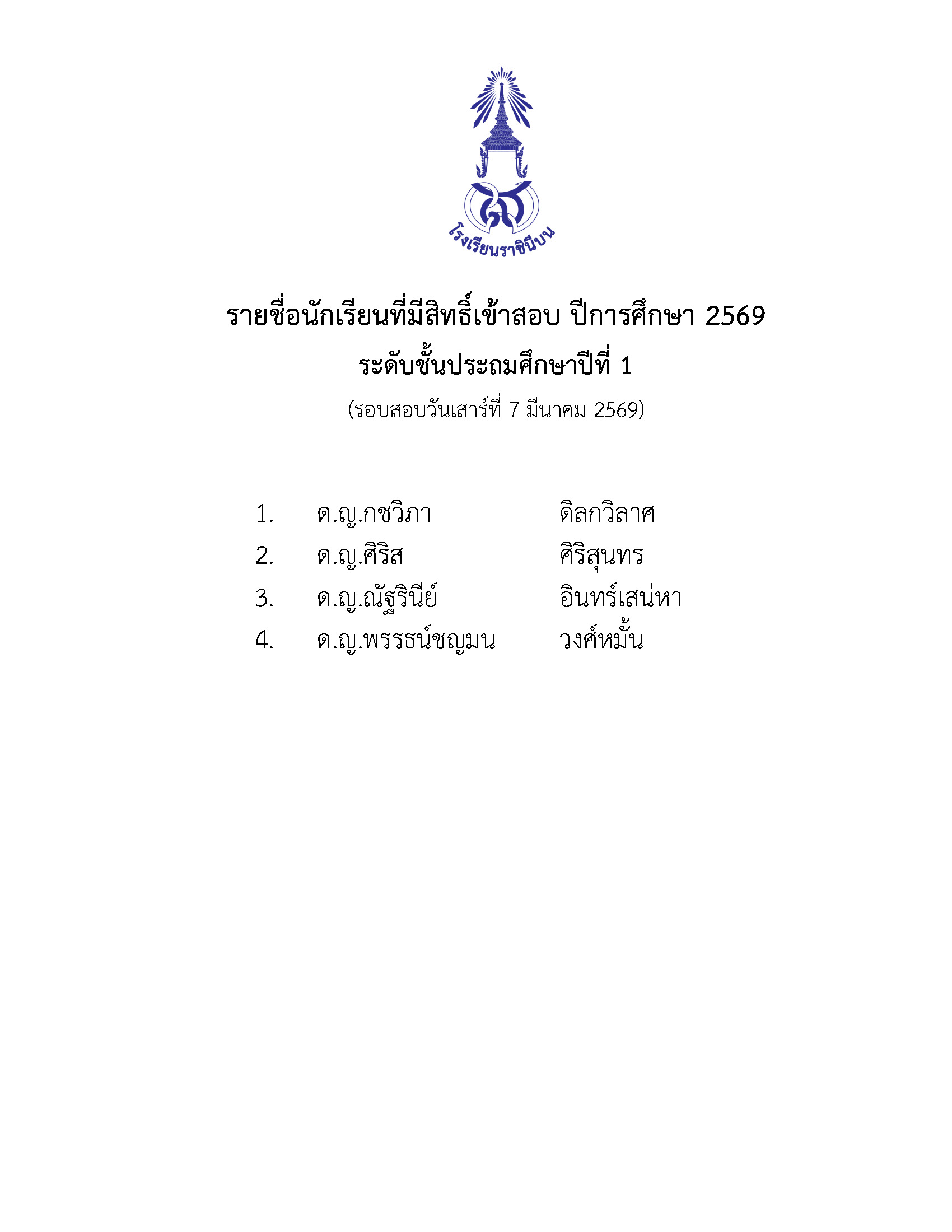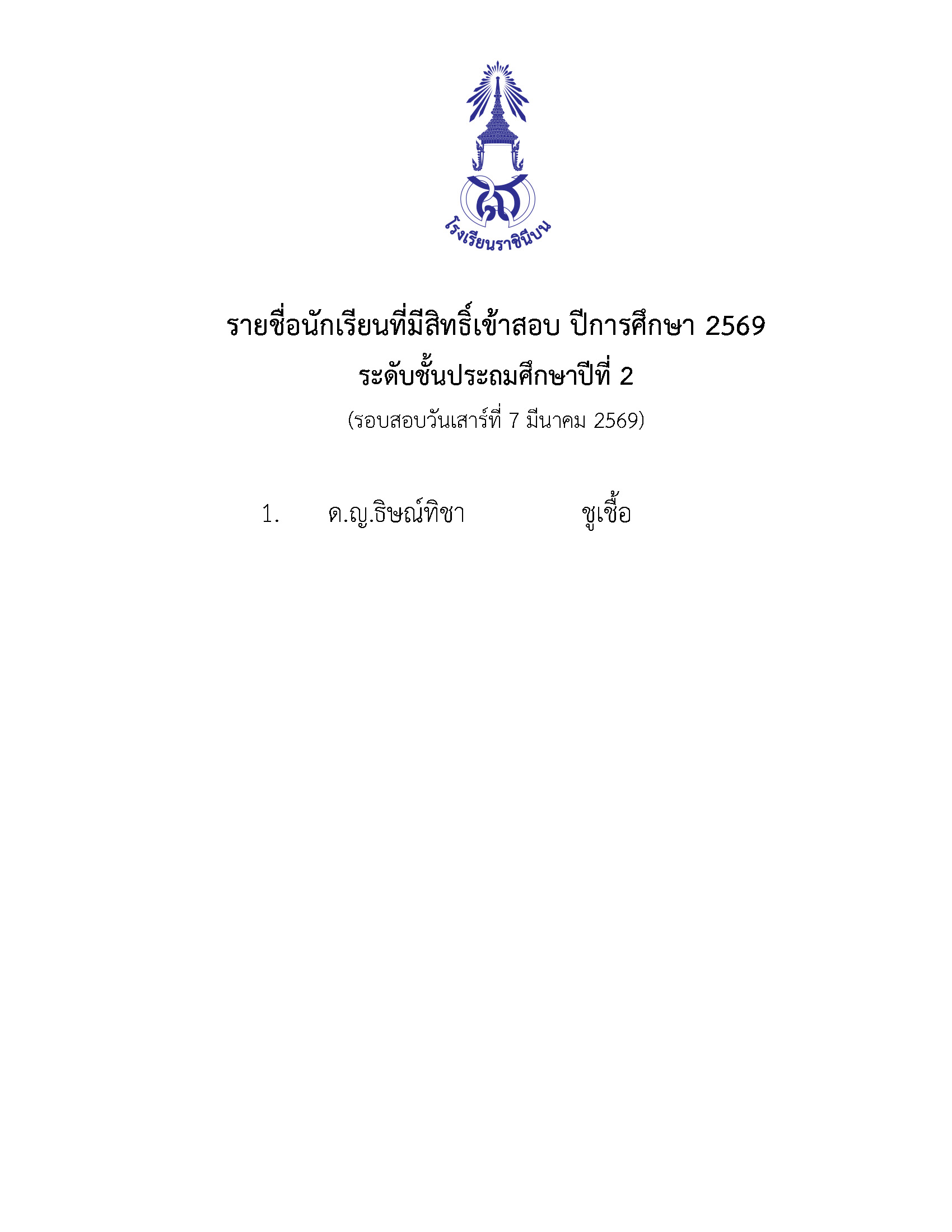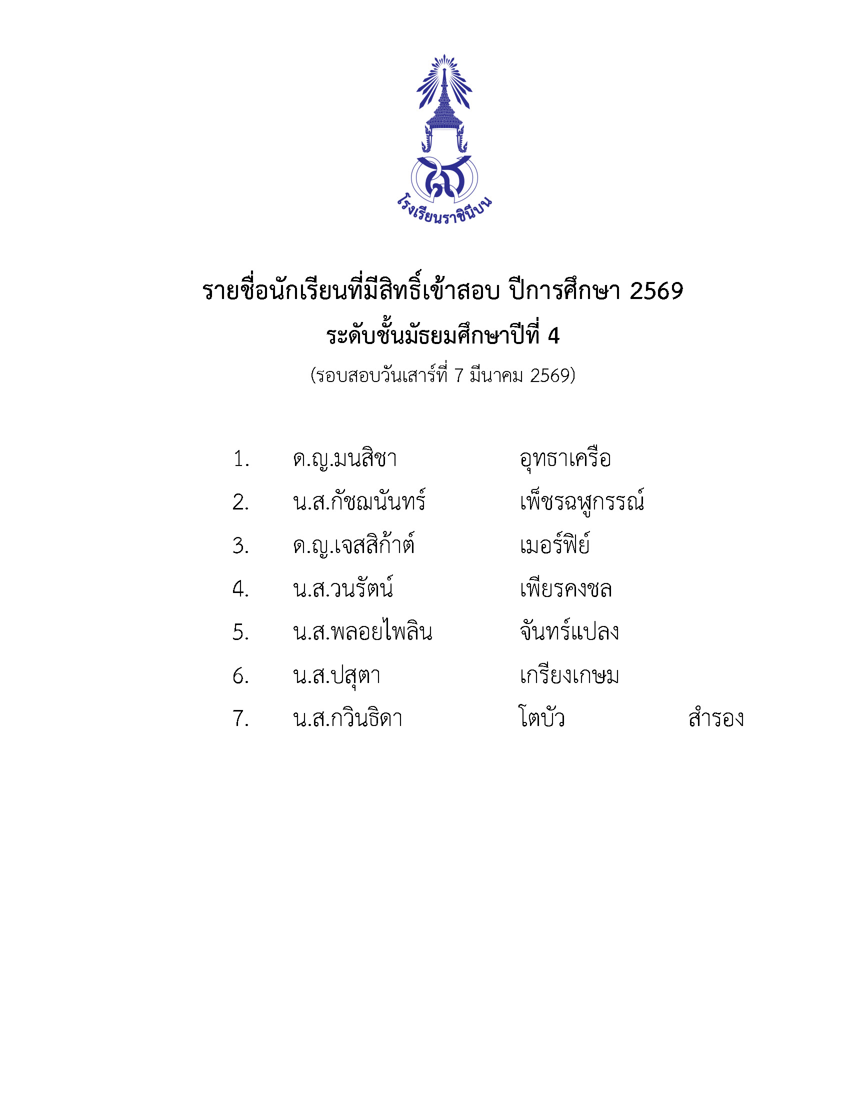 รายชื่อนักเรียนผ่านการคัดเลือกเข้าเรียน ปีการศึกษา 2569