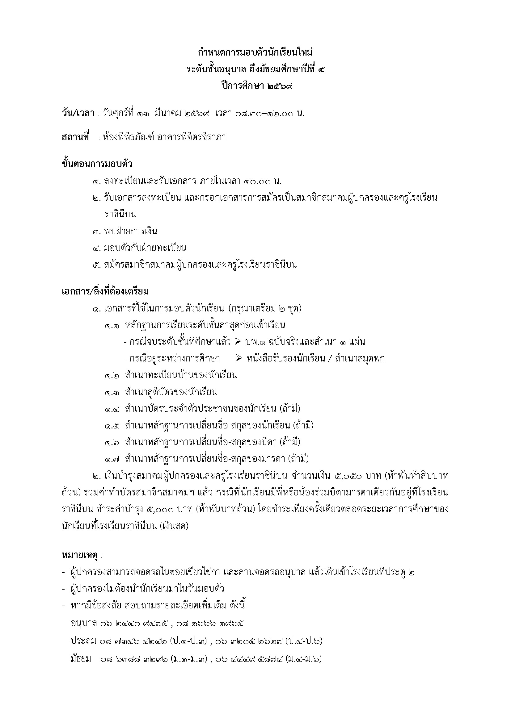 กำหนดการมอบตัว ชั้นอนุบาลปีที่ 1 ชั้นอนุบาลปีที่ 2 ชั้นประถมศึกษาปีที่ 1 ชั้นประถมศึกษาปีที่ 2 ชั้นประถมศึกษาปีที่ 5 ชั้นมัธยมศึกษาปีที่ 1 ชั้นมัธยมศึกษาปีที่ 2 ชั้นมัธยมศึกษาปีที่ 4